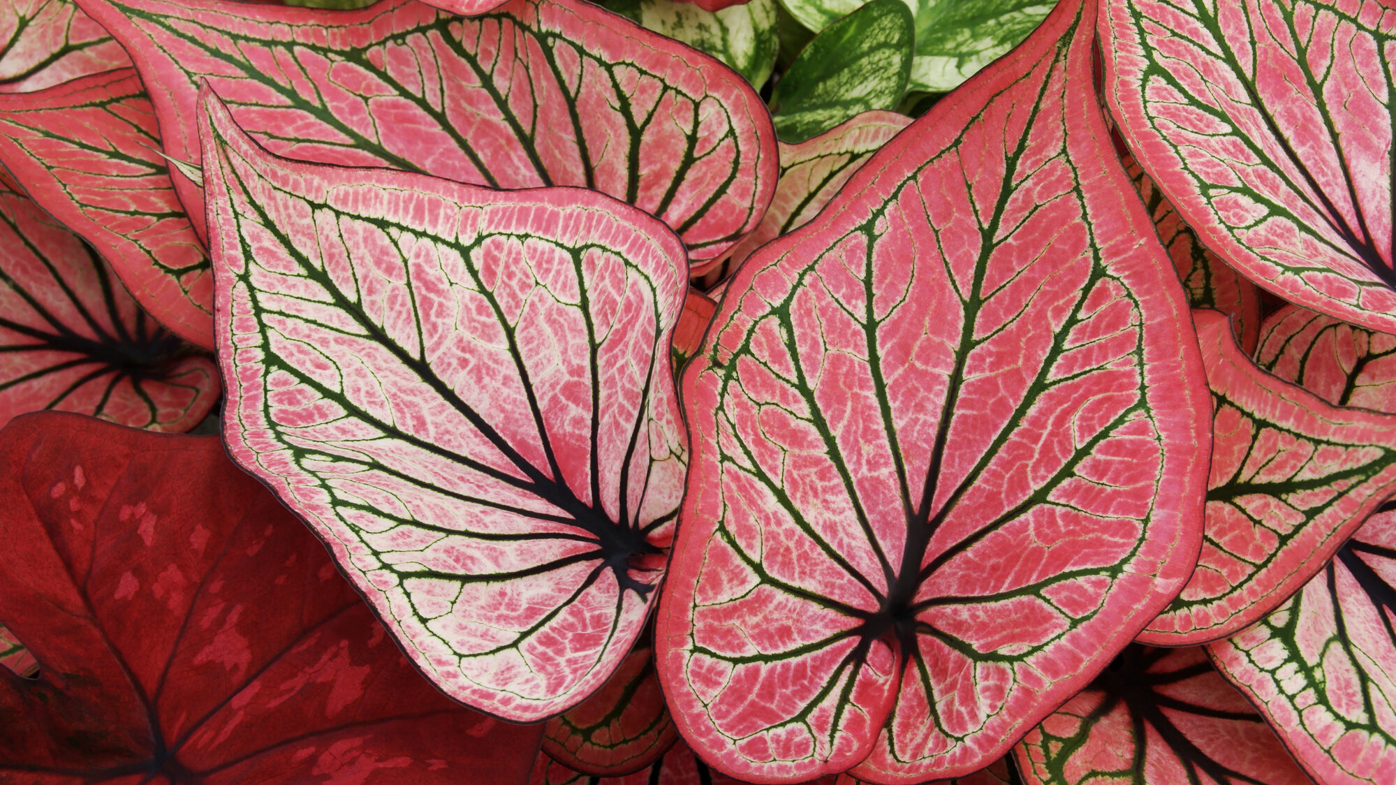 Large, heart-shaped leaves with vivid patterns and hues in caladium shades of pink, red, white and green. They are ideal for bringing a pop of color to any interior setting. They can provide year-round visual appeal when grown indoors. They do best in warm, humid conditions with moderate to strong indirect light.
